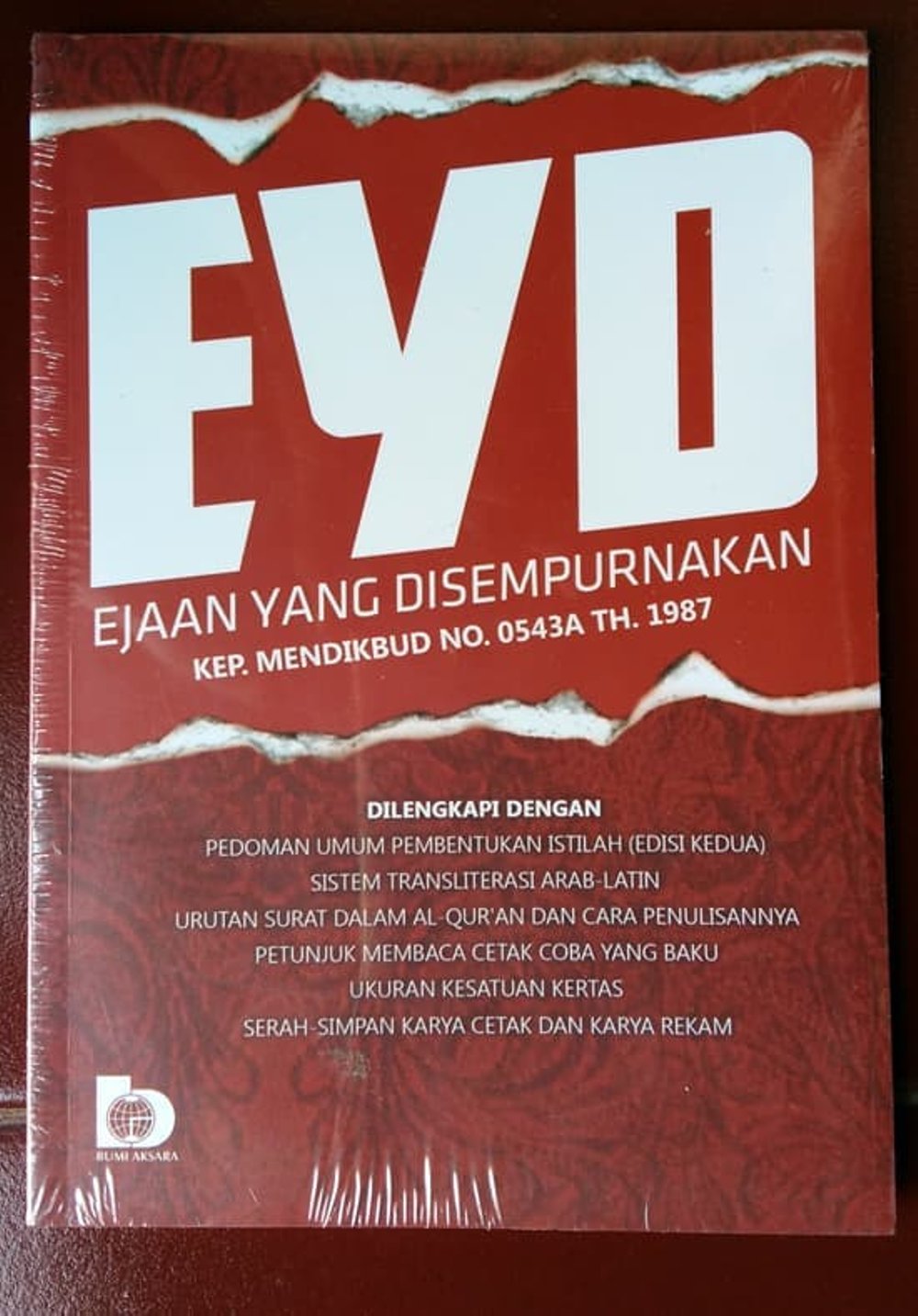Kurangnya pemahaman masyarakat Indonesia terhadap ejaan yang disempurnakan (EYD) mengakibatkan terjadinya kesalahan penggunaan bahasa, baik lisan maupun tulisan. Dengan diterbitkannya buku ini diharapkan dapat mengurangi kesalahan masyarakat Indonesia dalam berbahasa. Buku ini dilengkapi pedoman umum pembentukan istilah, sistem transliterasi arab latin, urutan surat dalam Al-Quran dan cara penulisannya.